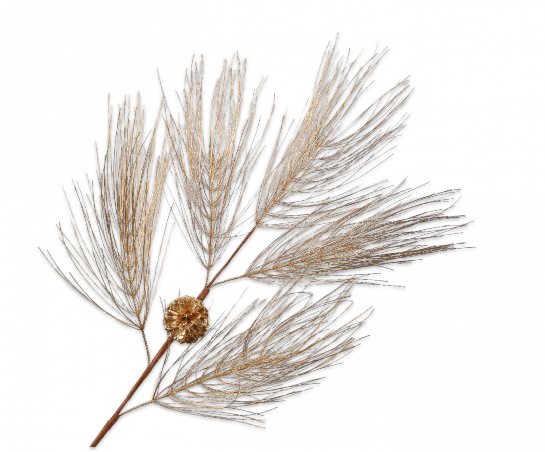 De naaldtak is helemaal goud met zelfs een gouden dennenappeltje in het midden.