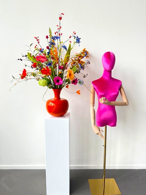 Dit boeket is zonder de vaas, wil je deze erbij bestellen, dan is dit een vaas van 35 cm hoog.